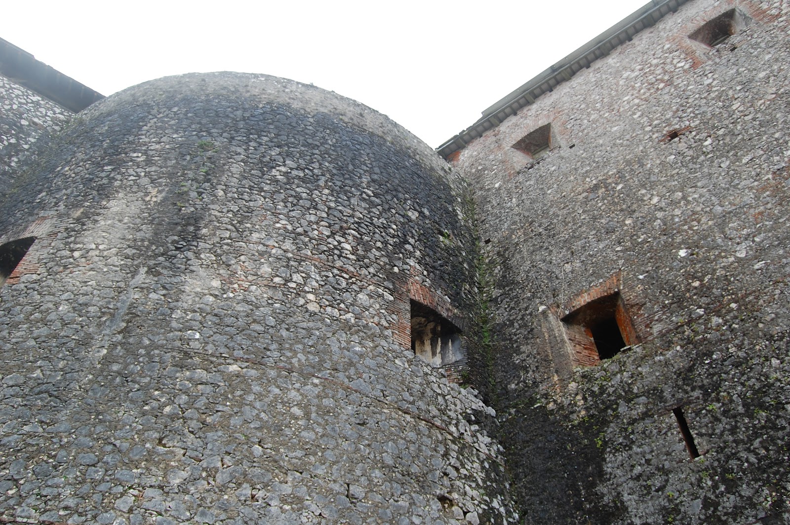We arrived at the little town that sits at the base of the mountain on which the Citadel resides. We drove up to the parking lot in front of the Sans-Souci Palace where Henri Christophe lived. We parked and were greeted with MANY men who wanted to be our guides and help us up to the Citadel. We visited the information booth and purchased entry tickets, but declined a guide ($60 US for a guide!). We drove up an exceptionally steep hill to the second parking lot. Parked and paid a guy to guard our car, declined handmade trinkets from many women, found a guide and walked up a slippery stone path for about twenty minutes until we reached the Citadel.